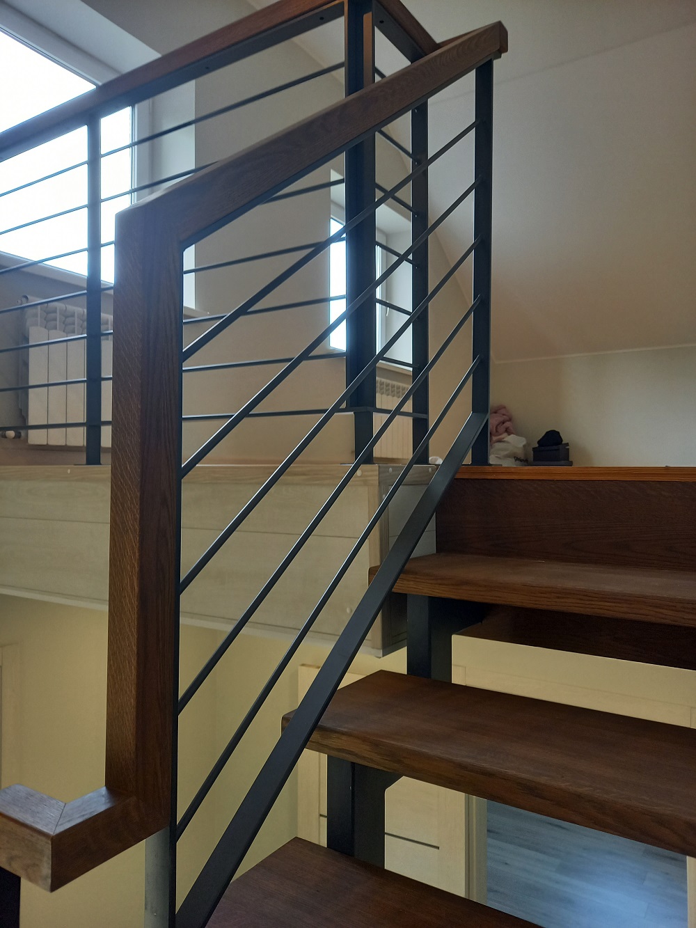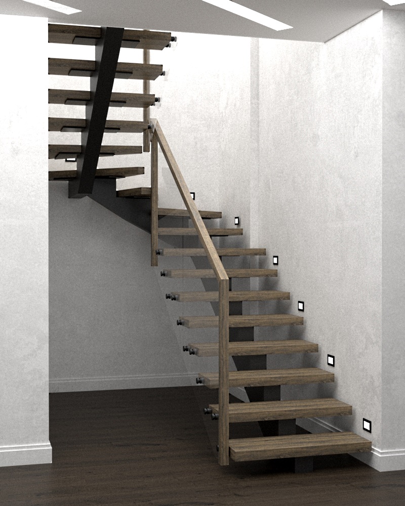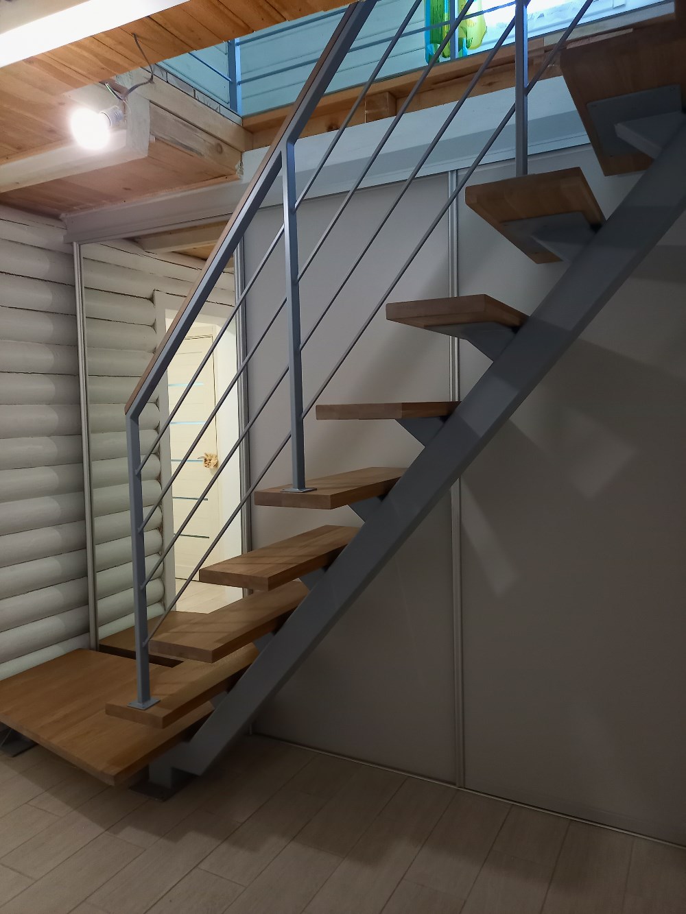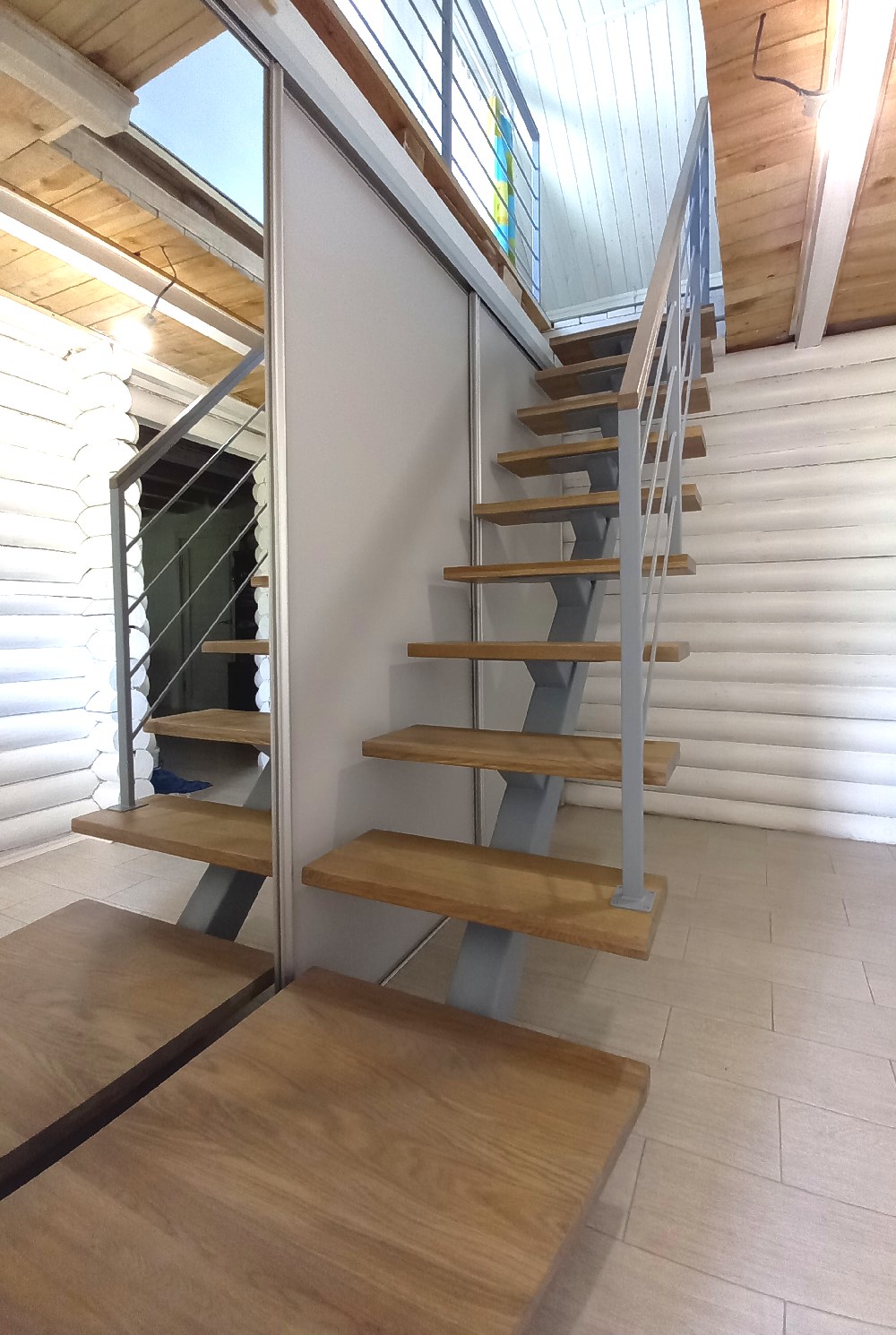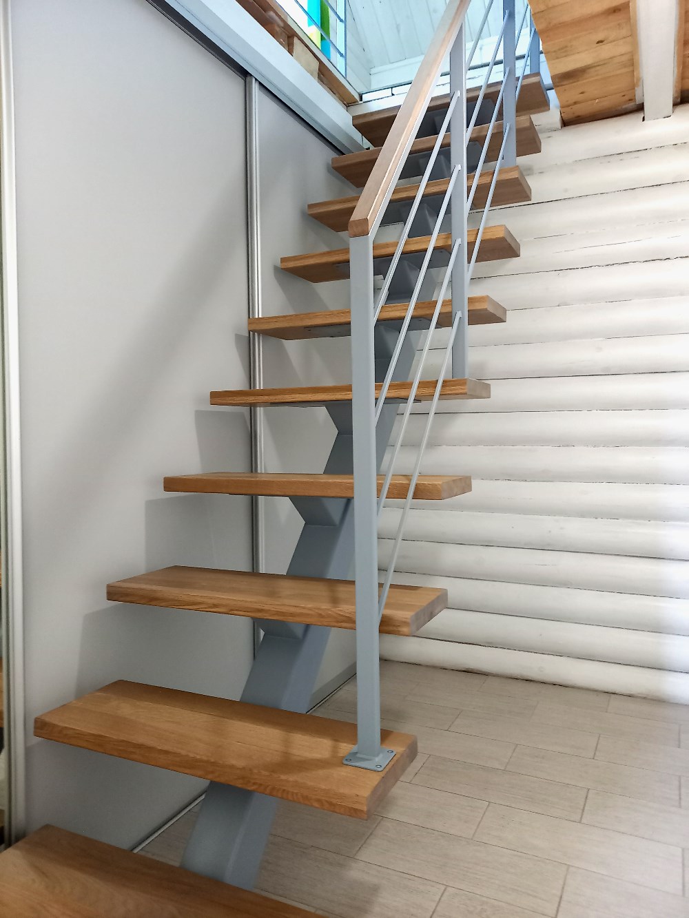 описание… Компактная лестница на центральном косоуре из профильной трубы. Ступени для лестницы из дуба цельноламельного с покрытием Rubio Monocoat. Ограждение металл с дубовой накладкой.