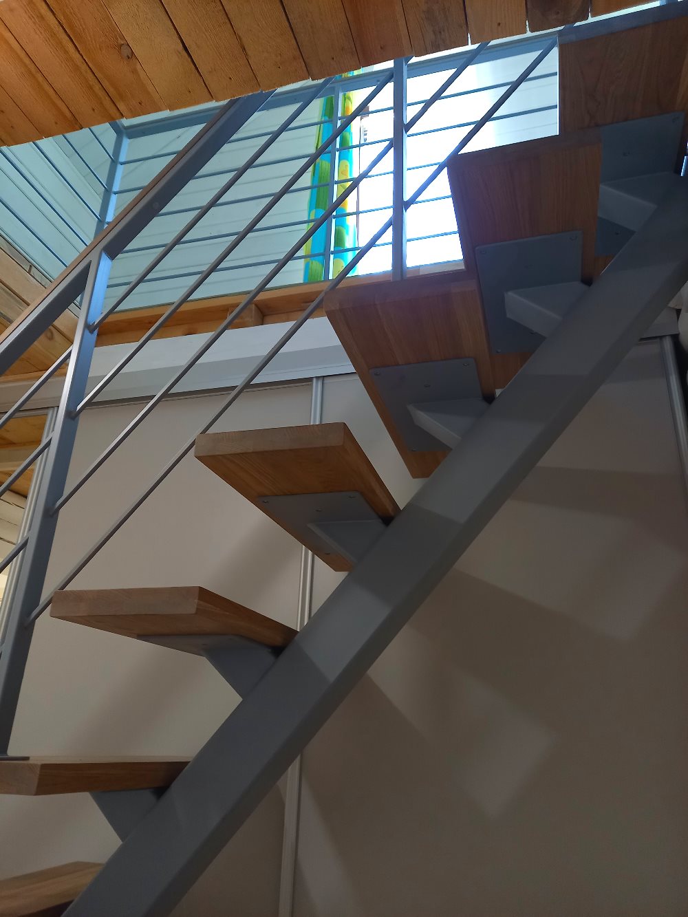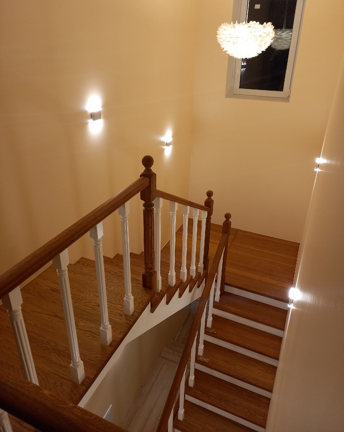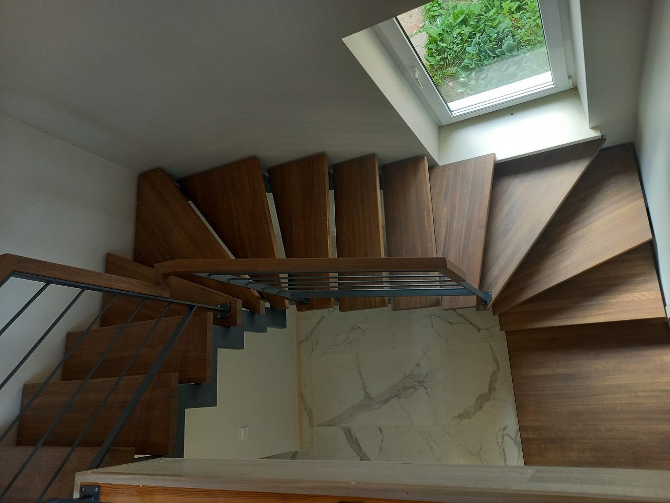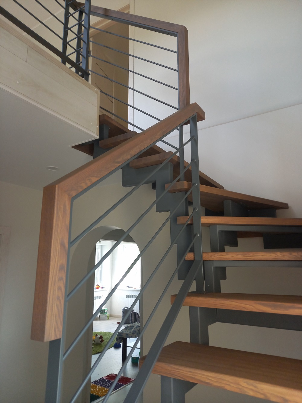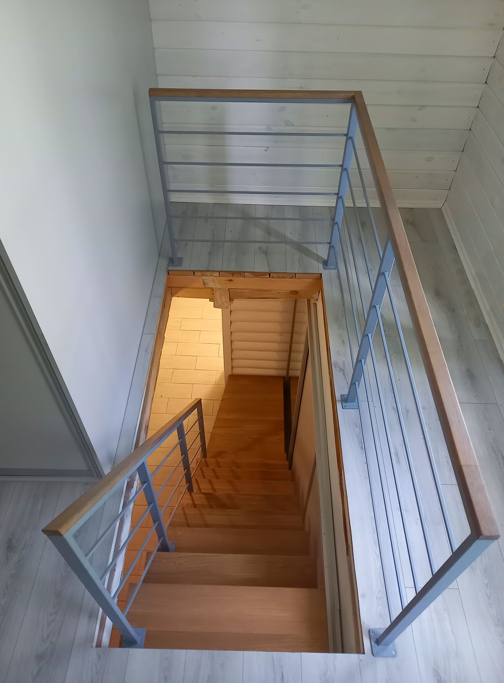 описание… Компактная лестница на центральном косоуре из профильной трубы. Ступени для лестницы из дуба цельноламельного с покрытием Rubio Monocoat. Ограждение металл с дубовой накладкой.