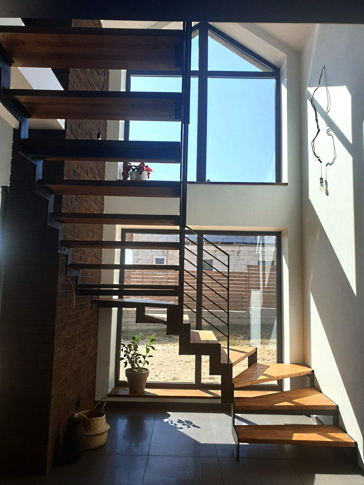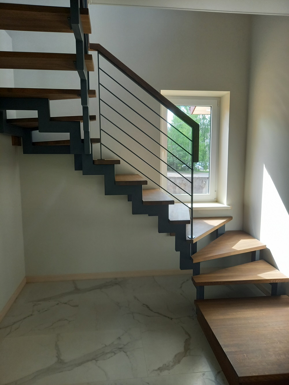 описание… Каркас лестницы изготовили из листовой стали 8мм, каркас сваривается в короб. Опорные пластины для лестницы 8 мм. Ступени для лестницы изготовлены из дуба с покрытием лаком акриловым.