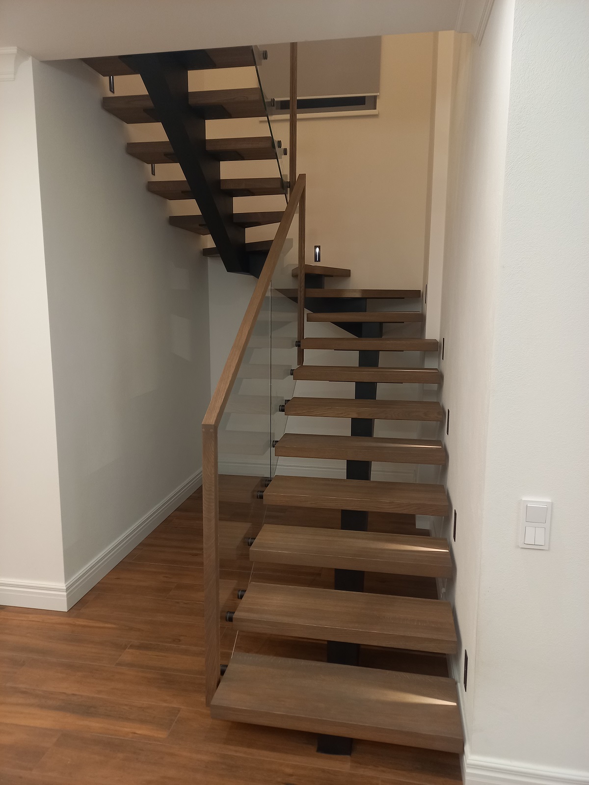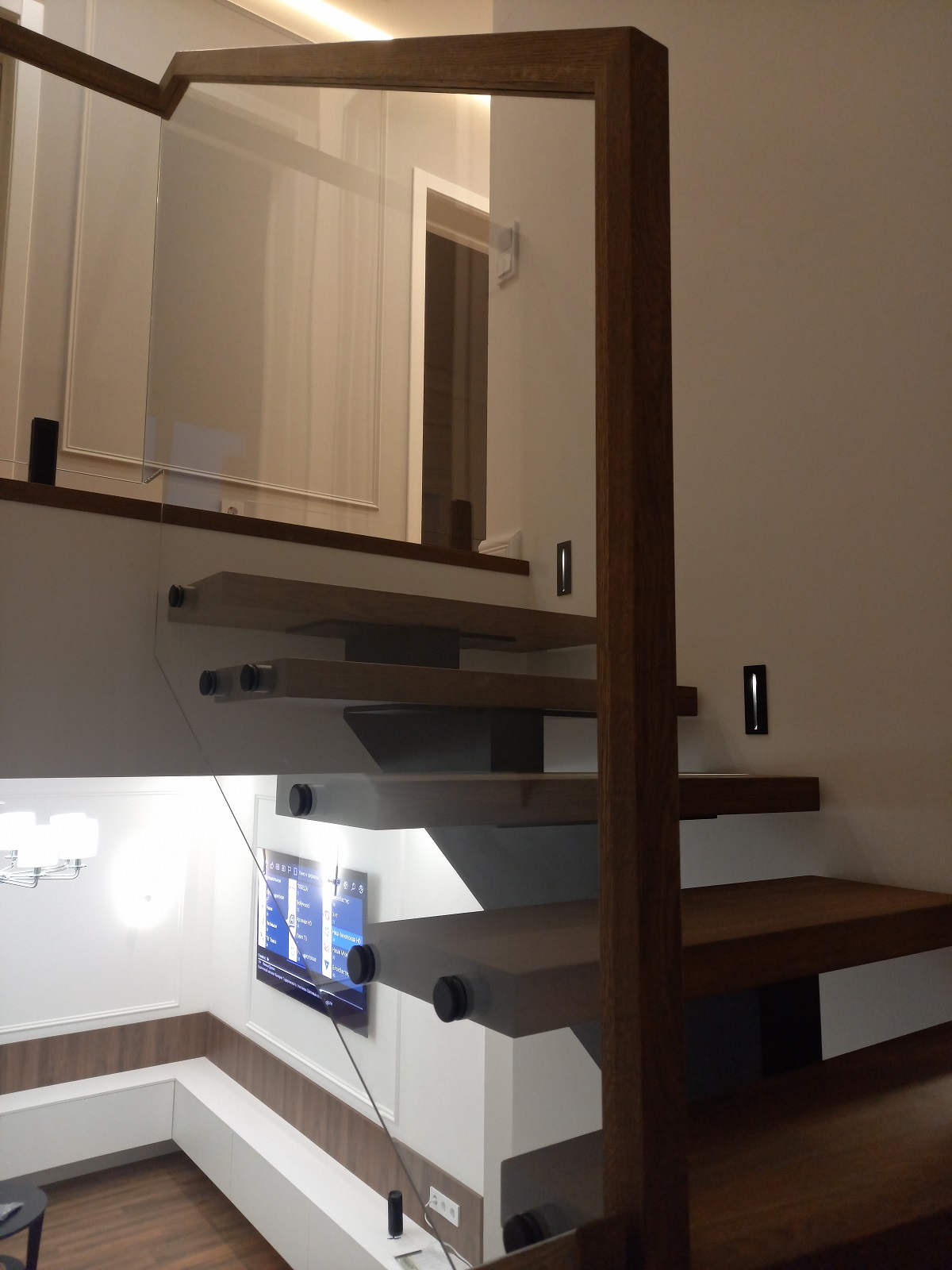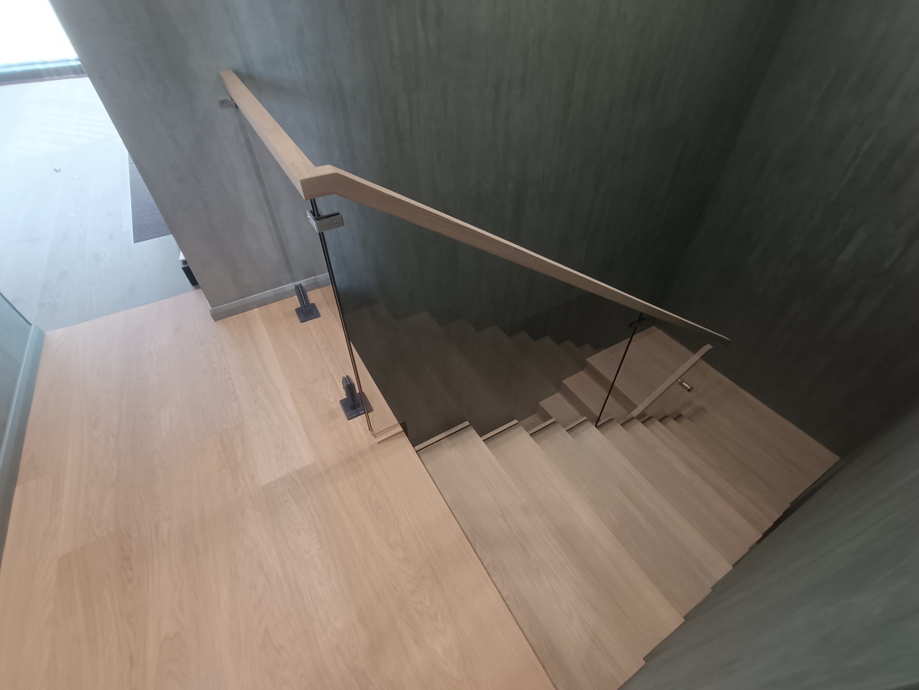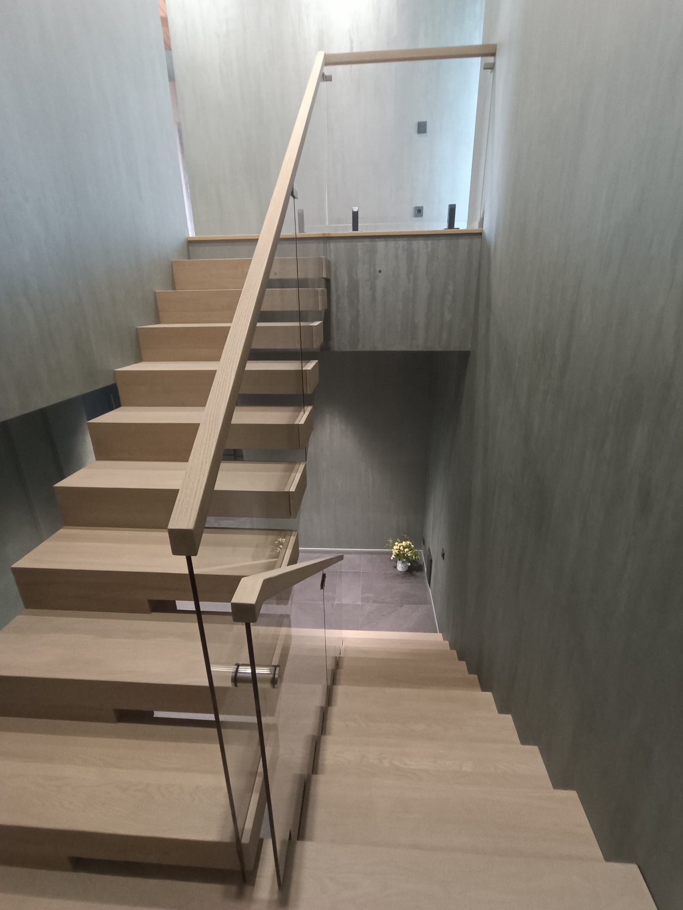 описание… Лестница на металлическом каркасе из листовой стали .Ступени для лестницы из дуба 50 мм цельноламельного с покрытием бельгийским маслом. Ограждение: стекло осветленное закаленное 10 мм