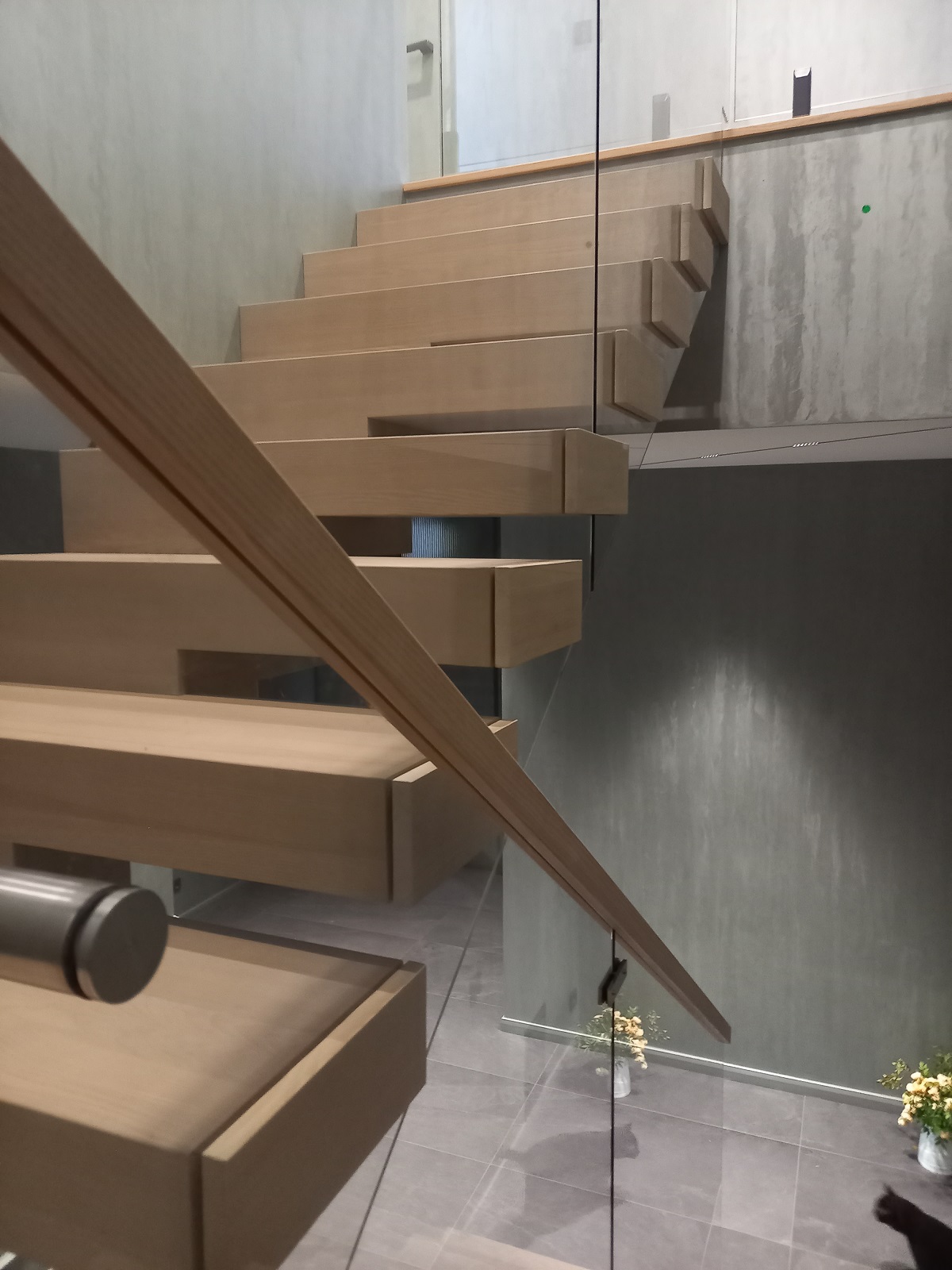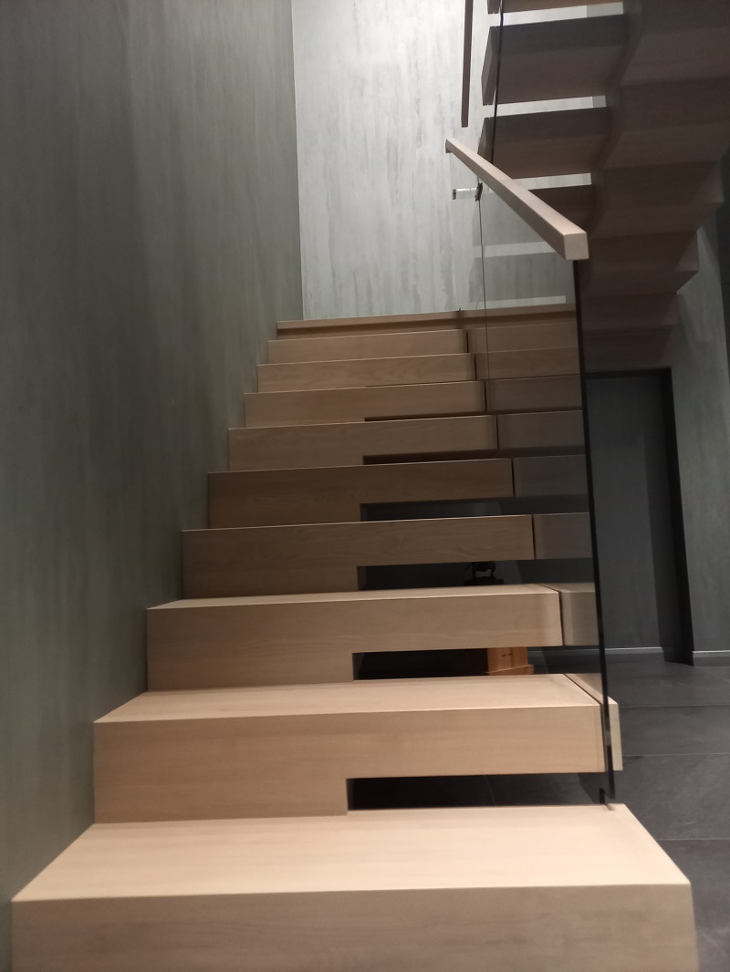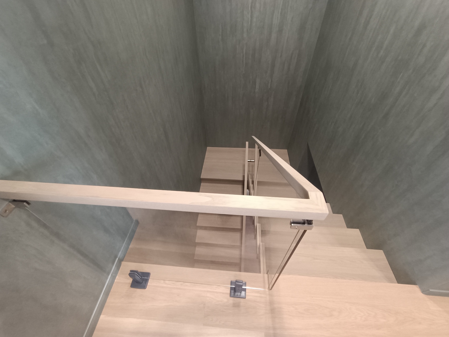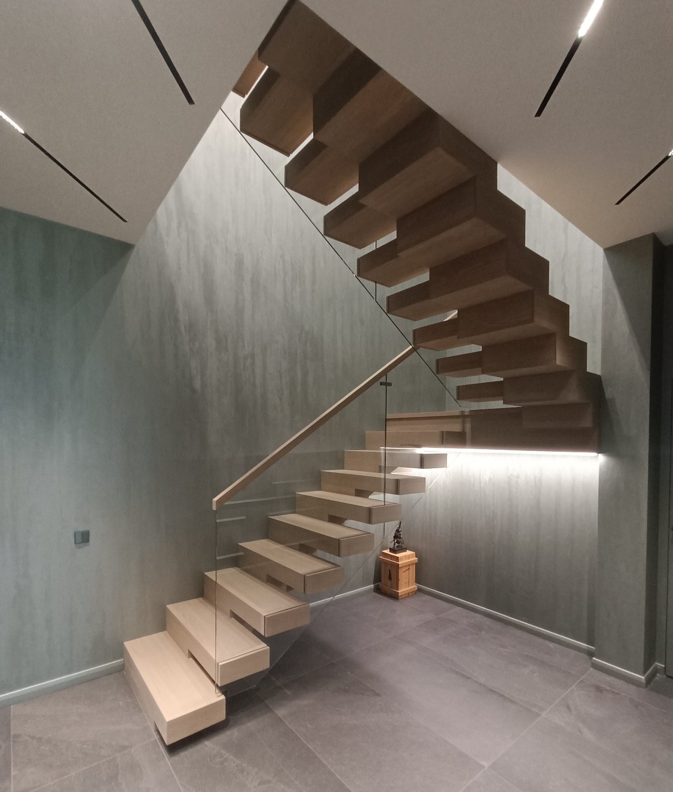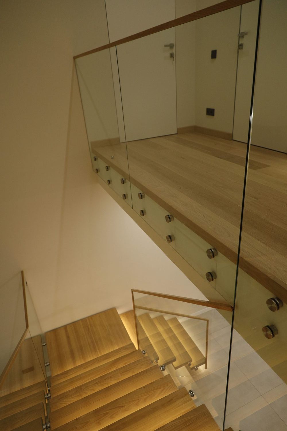 описание… Лестница на металлическом каркасе из листовой стали .Ступени для лестницы из дуба 50 мм цельноламельного с покрытием бельгийским маслом. Ограждение: стекло осветленное закаленное 10 мм