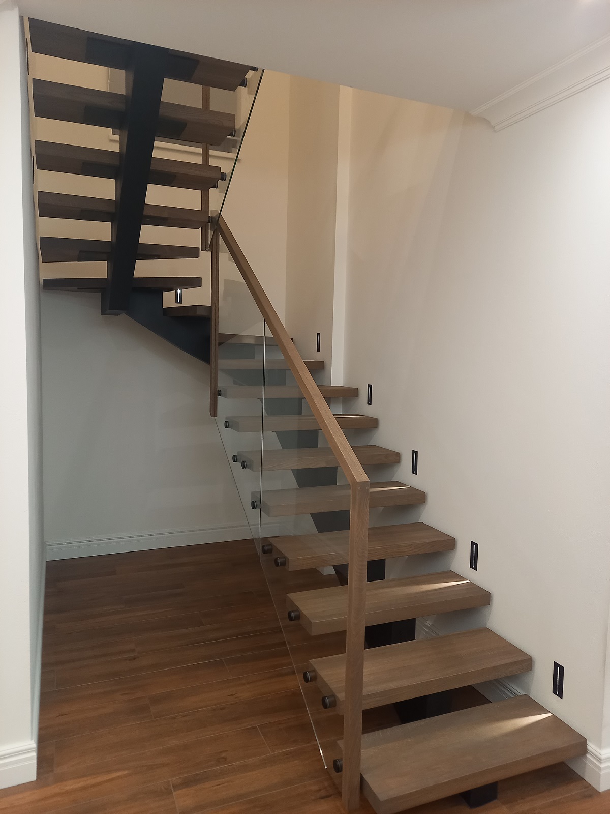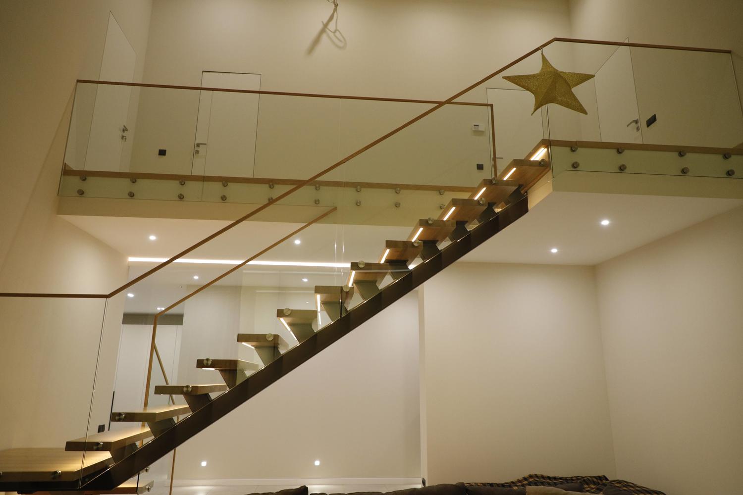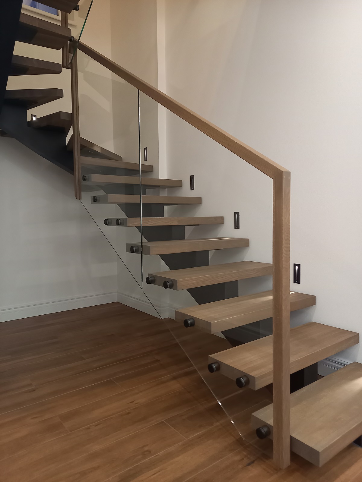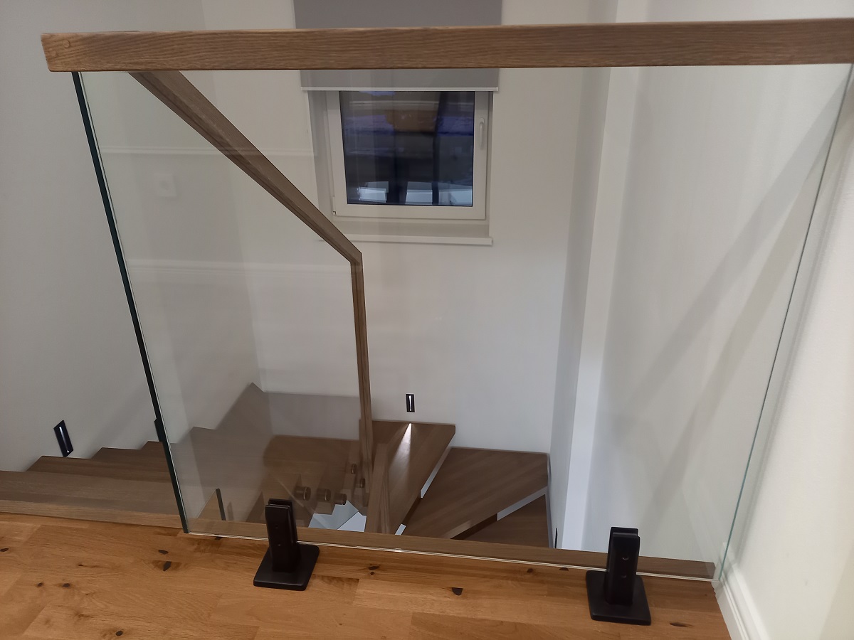 описание… Лестница на металлическом каркасе из листовой стали .Ступени для лестницы из дуба 50 мм цельноламельного с покрытием бельгийским маслом. Ограждение: стекло осветленное закаленное 10 мм