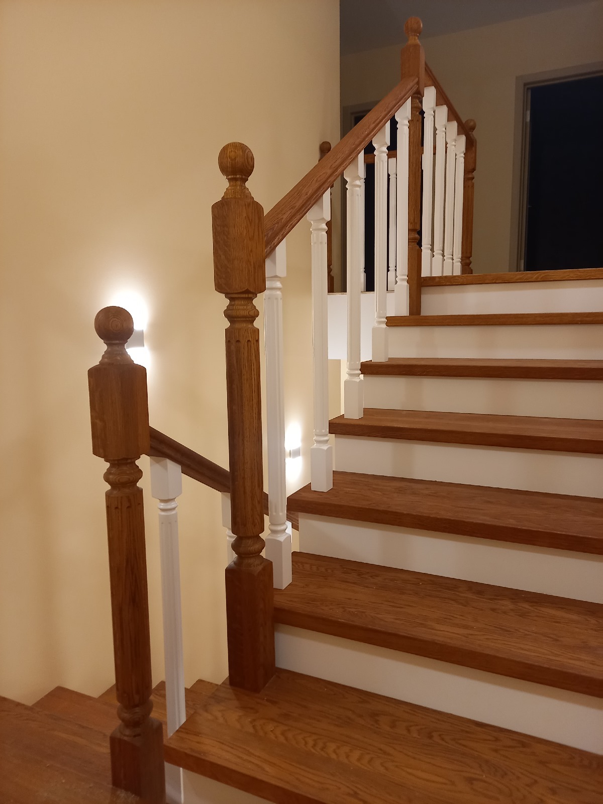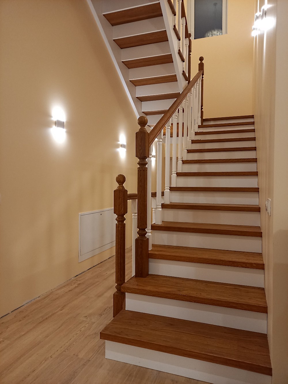 описание… Каркас лестницы изготовлен из профильной трубы 120*120*4. Опорные пластины толщиной 6 мм. Ступени для лестницы из дуба цельноламельного с покрытием бельгийским маслом. Ограждение из металла с дубовым поручнем