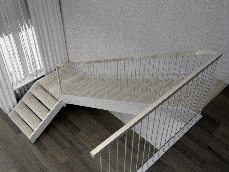 описание… Лестница на центральном косоуре из проф.трубы 120*120*4. Ступени дуб. Пристенный поручень дуб.